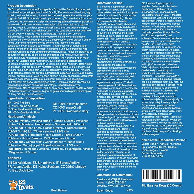 - Flavorful: Indulge your canine companion with 123 Treats' 100% pork chews, a premium pet treat that includes savory dog pig ears, made from high-quality pork sourced from Brazil and Colombia. These treats are expertly oven-roasted to enhance their delicious natural flavors, capturing the irresistible taste that dogs crave. They’re as tasty as the bacon that meat eaters love for breakfast, ensuring your pups are getting a flavor-packed treat they'll adore.
