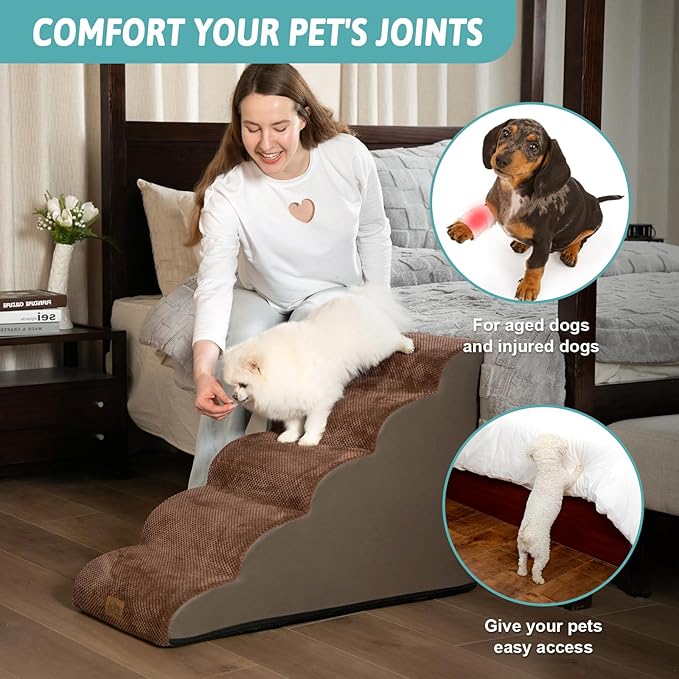 Dog Stairs for High Bed 22.6" H, Small Dog Step for Puppy, Older or Cat, Curved Ramp for Car, Ladder with High Density Foam, Lightweight, Durable, 15.7x33x22.6 inch, 5 Step, Brown