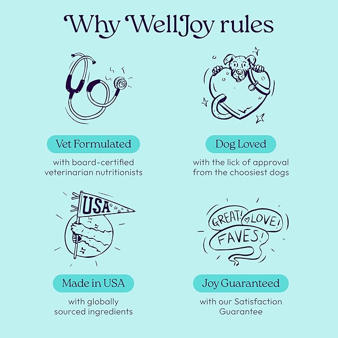 - Why WellJoy: Every WellJoy treat and supplement includes GutBoost in every bite making it the smart, simple – and scrumptious – way to boost your dog's top-to-tail wellbeing – and joy!