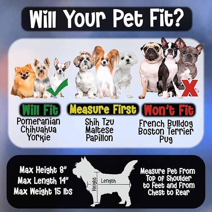 - [MAX HEIGHT 8 INCHES] This is a carrier for small dogs and cats. Maximum height 8 inches, max length 14 inches, max weight 15 lbs. If your pet is larger it will be a tight fit.